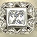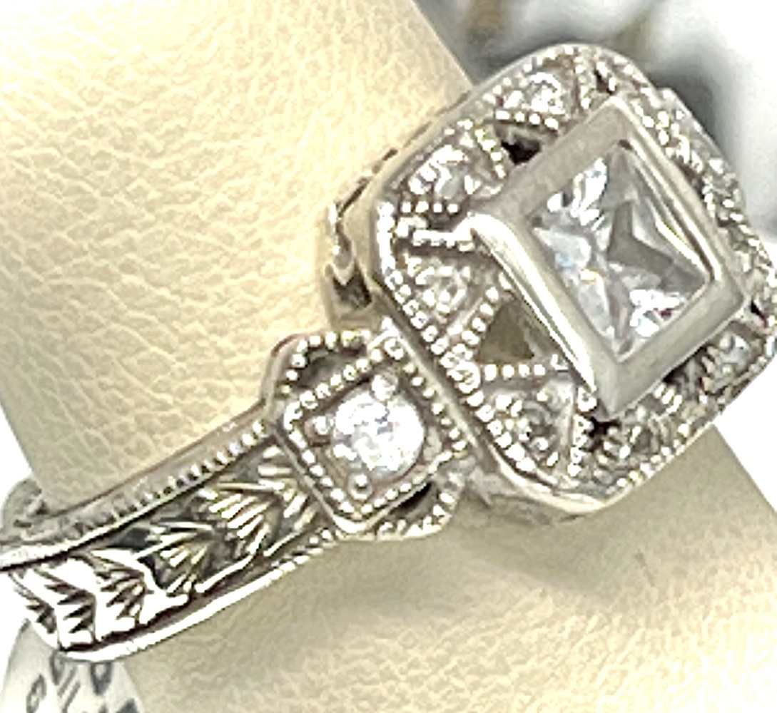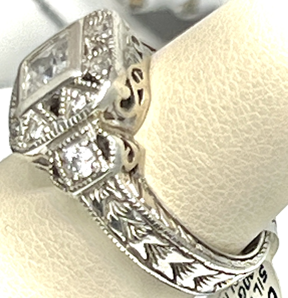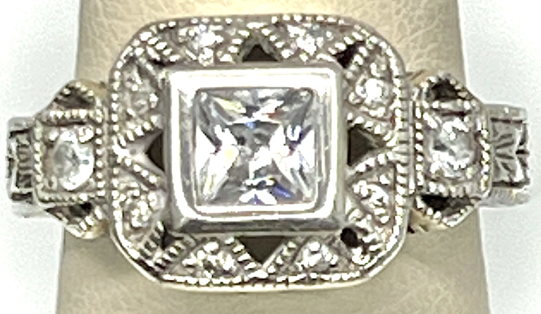 EXPERIENE VINTAGE GLAMOUR WITH THIS STERLING SILVER RING, BOASTING A SQUARE SETTING OF SPARKLING CUBIC ZIRCONIA, WRAPPED IN INTRICATE TIMELESS DESIGNS. A TRUE TREASURE.