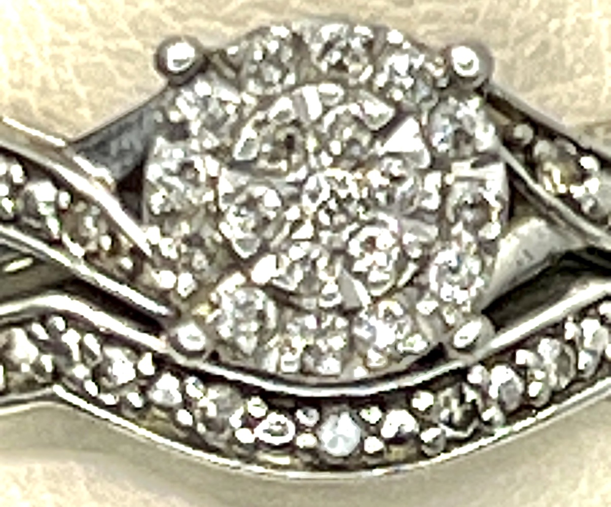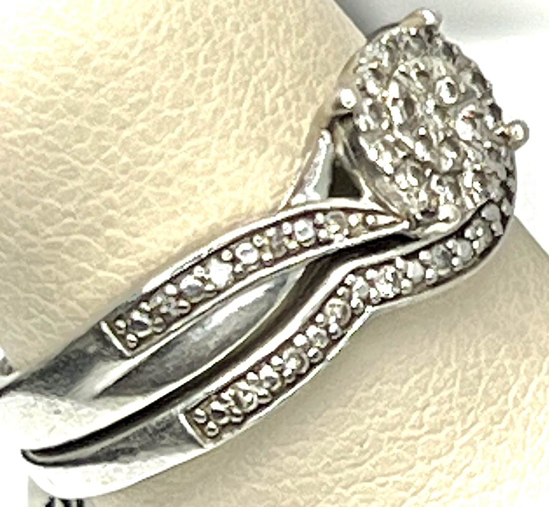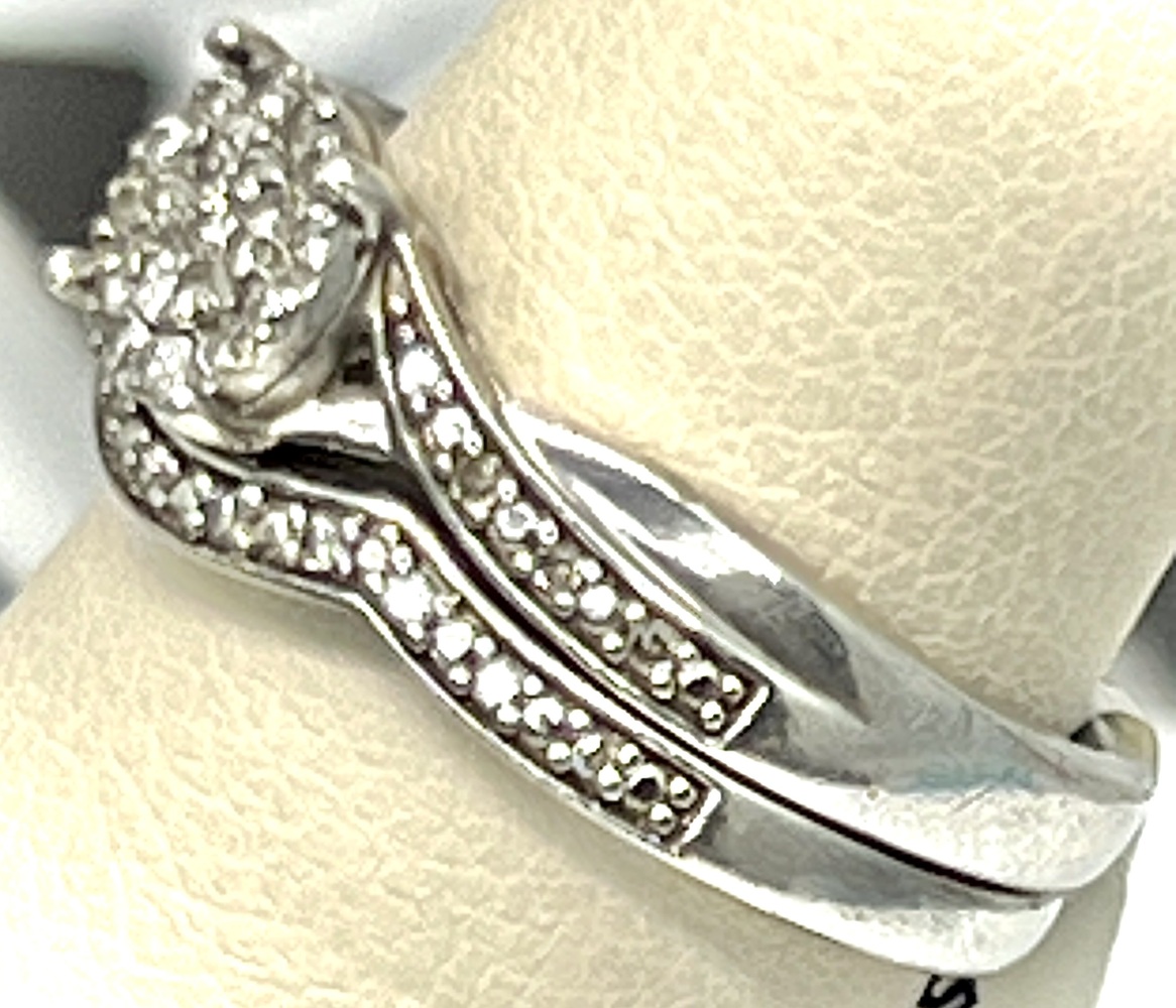 EXQUISITE STERLING SILVER WEDDING SET, ADORNED WITH A DAZZLING ROUND CLUSTER, FOR AN ETERNAL TESTAMENT OF LOVE AND DEVOTION.