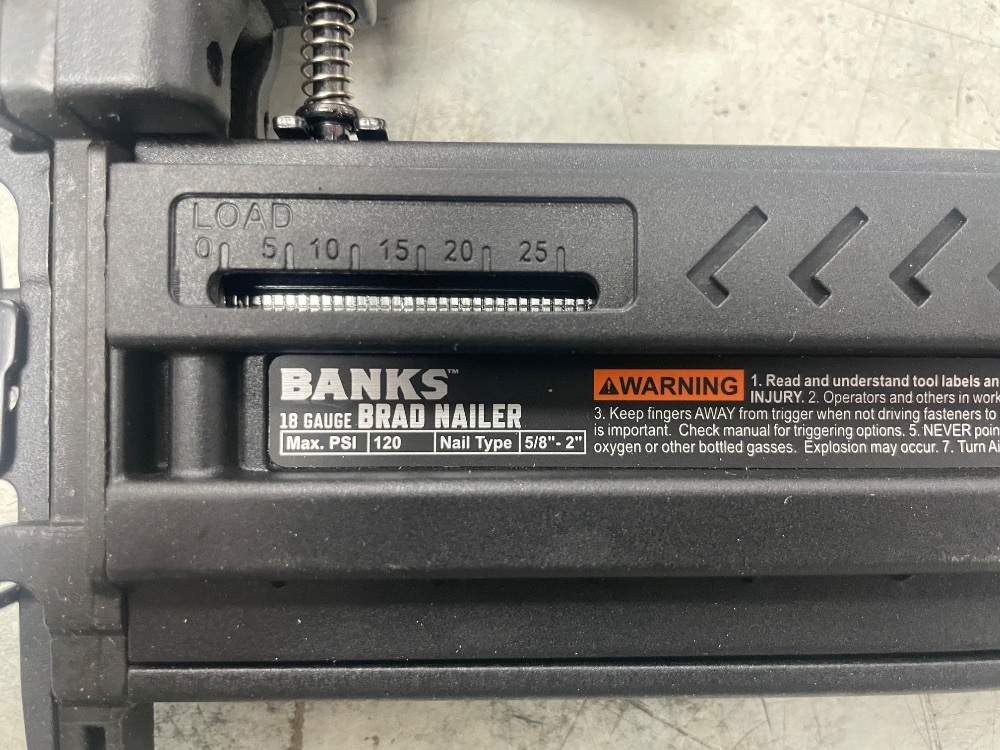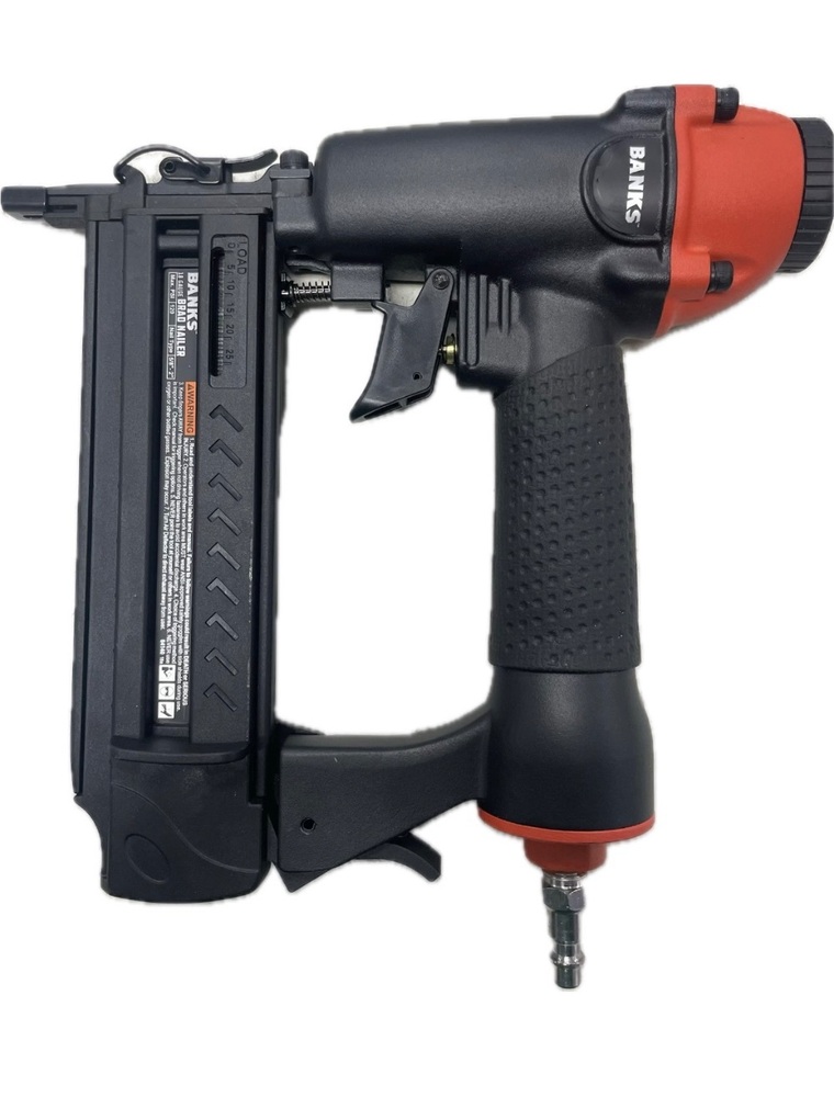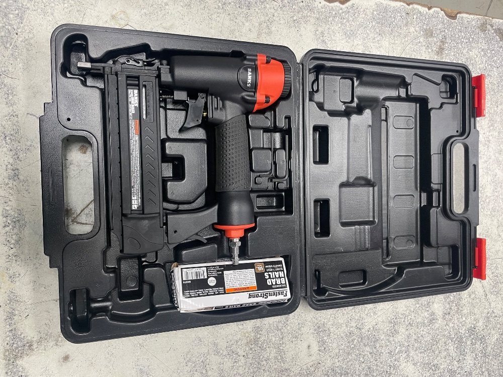 Introducing the Banks 61640, a sleek 18-gauge brad nailer, housed in a chic black box. Unleash the power, precision, and rugged beauty hidden within this compact, professional toolkit. A must-have for every craftsman, this is an unparalleled blend of sophistication and performance.