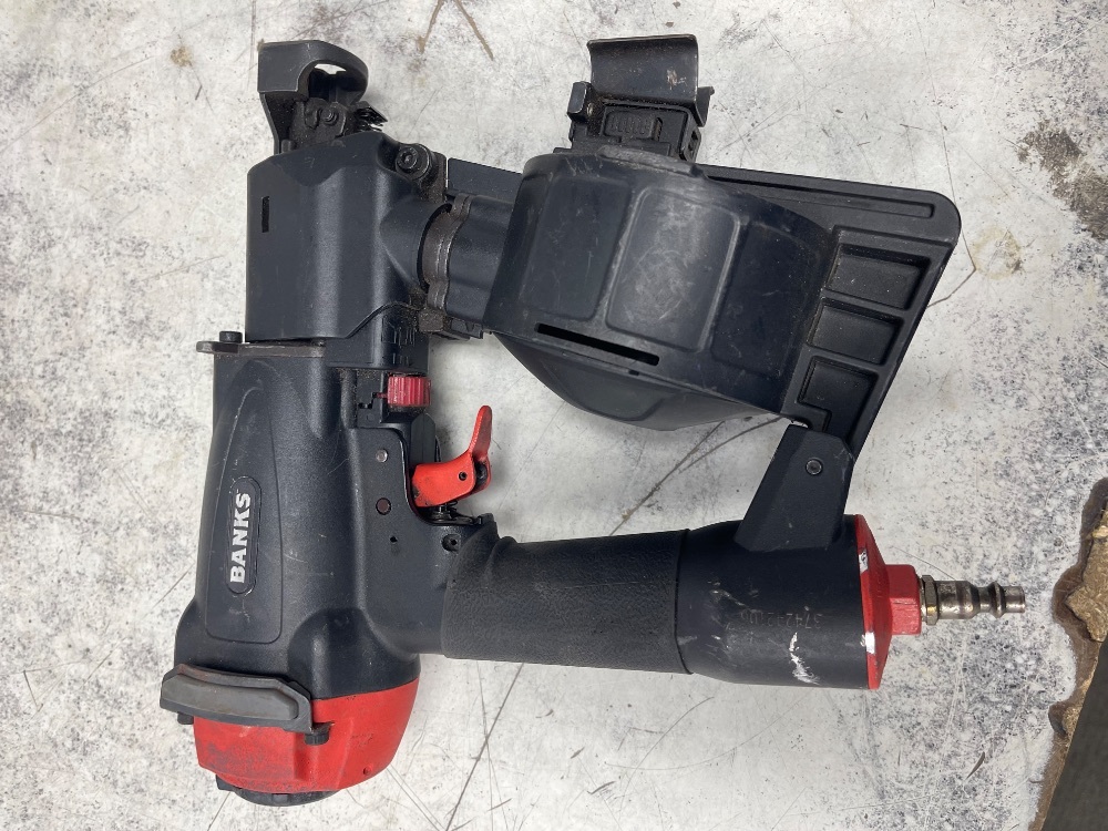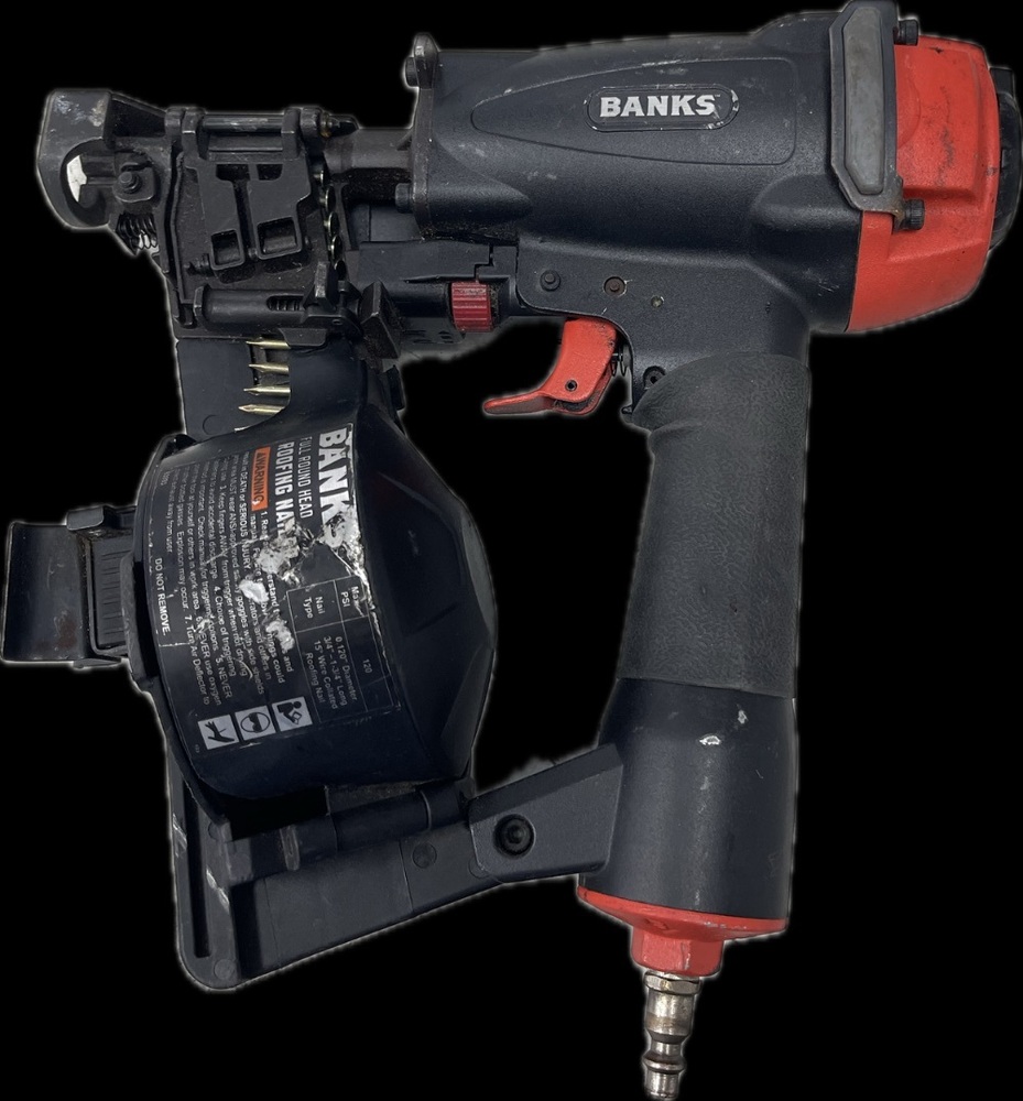 Unleash the power of the BANKS 18GA Pneumatic Roofing Nailgun! Compact yet mighty, it drives nails through the toughest roofing materials with ease. Bid goodbye to hand nailing; welcome fast, efficient, and tireless roofing. Experience the indomitable force of pneumatic perfection! Life's a breeze with BANKS 18GA
