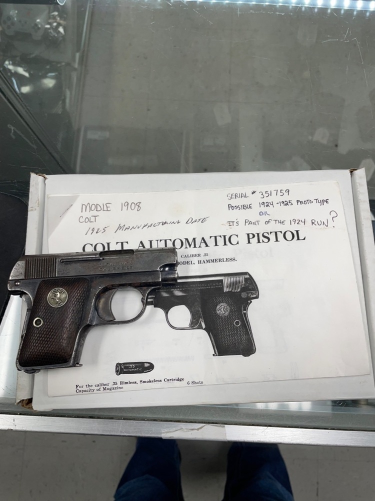 Experience the sleek elegance of Colt's vintage artifact. Unearthed from Hartford CT, reminiscing of a time gone by, is this majestic .25 AUTO Cal. COLT AUTOMATIC pistol. Branded with the distinguished SN: 351759 MODEL 1908, it comes with authenticity paperwork, nestled in a mysterious black case. A treasured find from the archives of Colt's PT. FA. MFG. CO., awaiting a true connoisseur's grasp.