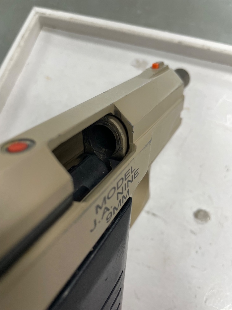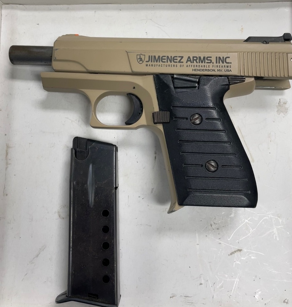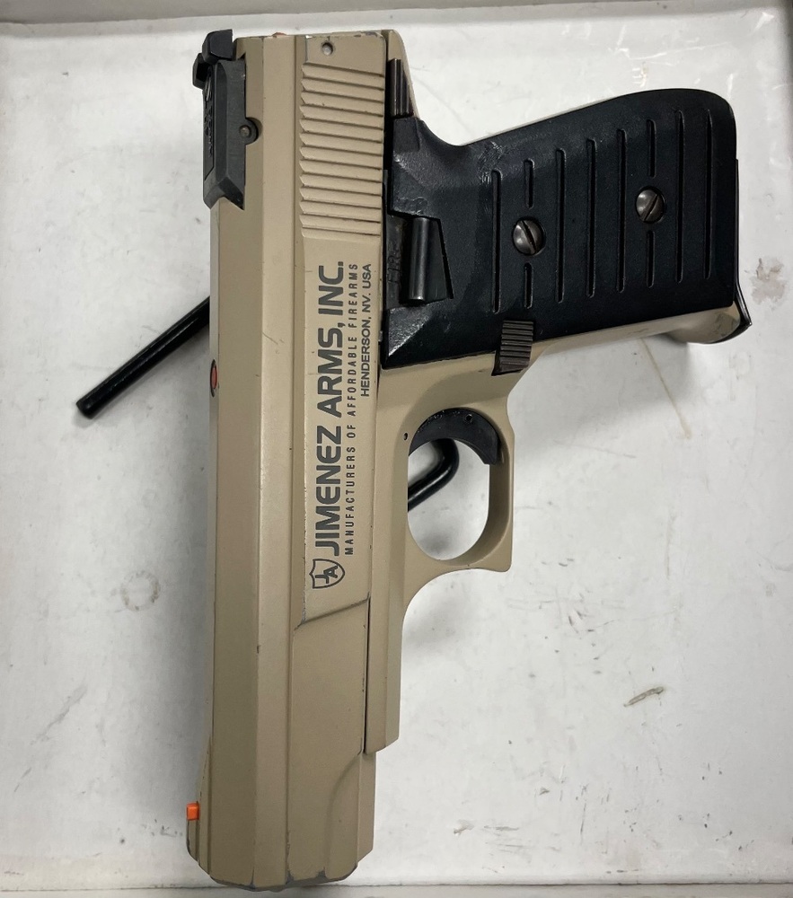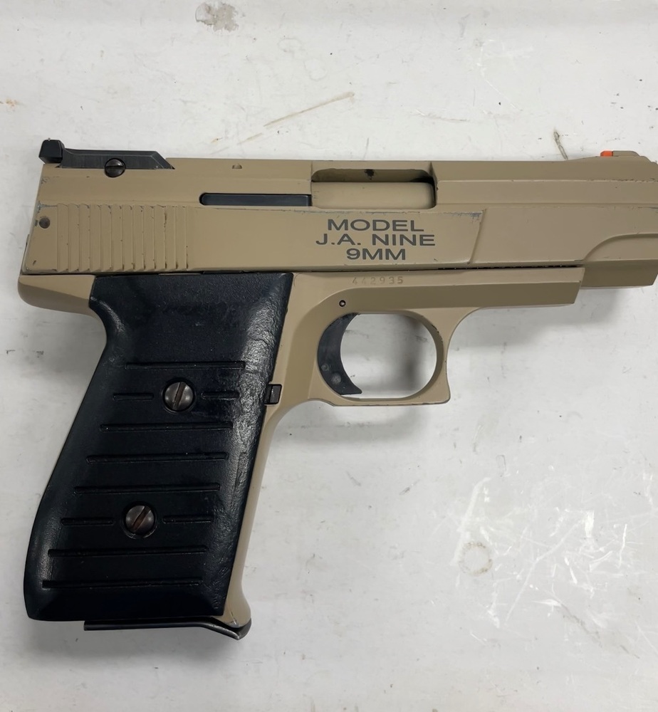 Possessing an alluring Stainless finish, this semi-automatic Jimenez Arms Pistol comes in a distinctive 9MM Cal. Flanked by a jet-black grip, the J.A. NINE, arrayed with the unique serial number 442935, pairs flawlessly with its accompanying brown clip - an enthralling fusion of power and aesthetics.