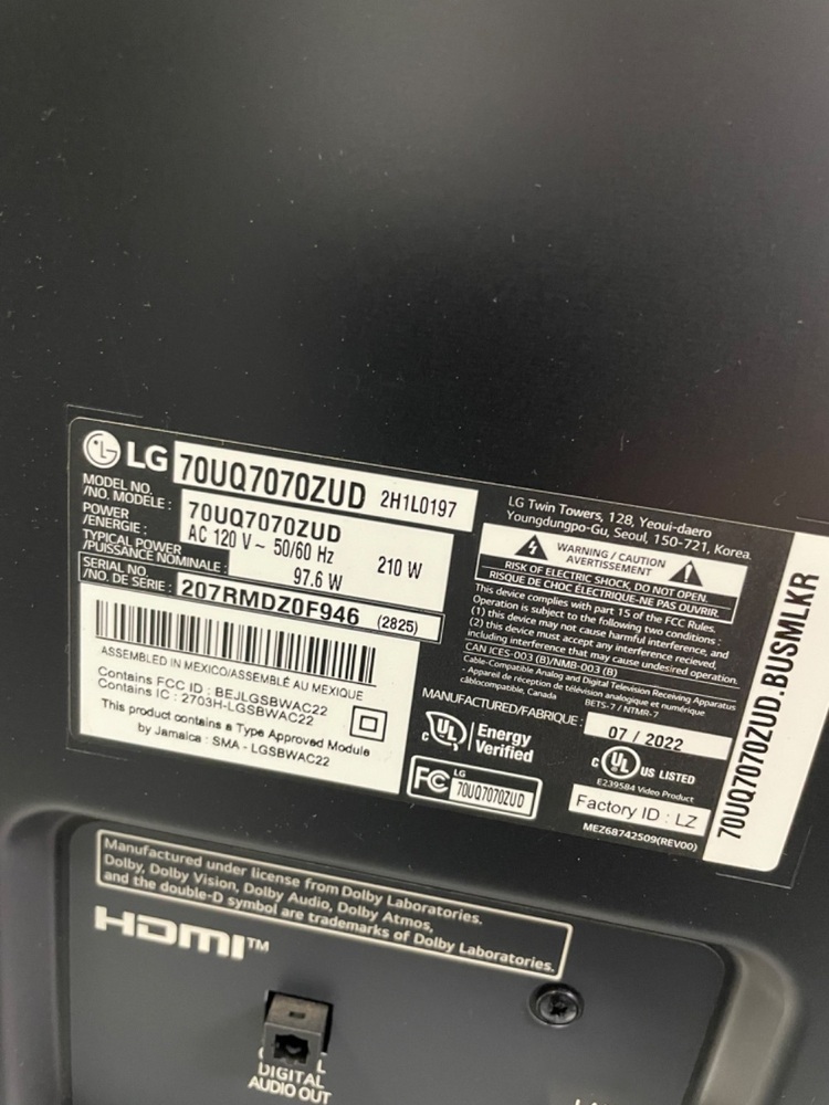 Experience the magic of thrilling visual grandeur with the LG70UP7070PUE! This colossal 70-inch LG TV, armed with a mighty power cord and handy remote, promises pure, immersive viewing entertainment. Bathe your senses in high-definition wonders as you dive into a world beyond boundaries. SN: 110RMFPB1723, ID: 318129- your passport to unparalleled visuals!