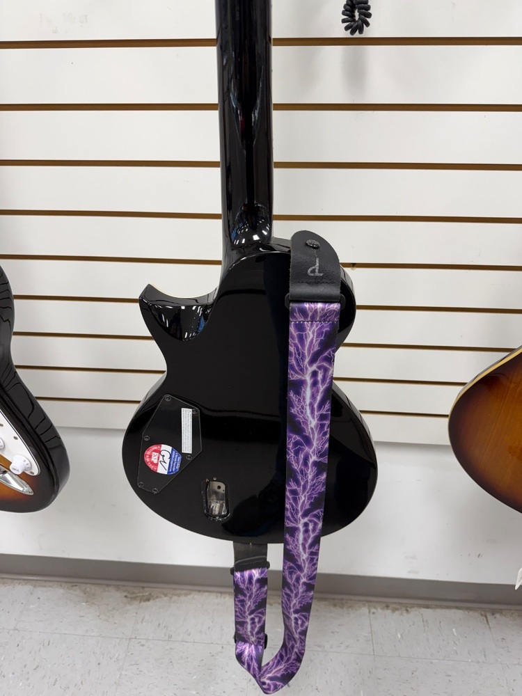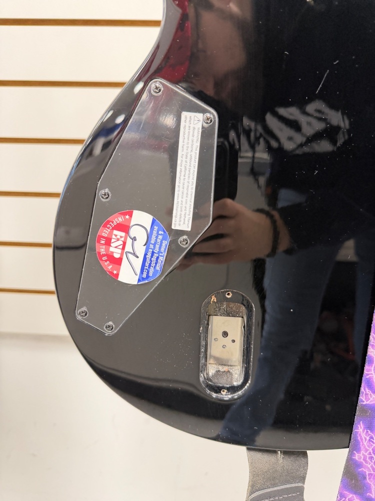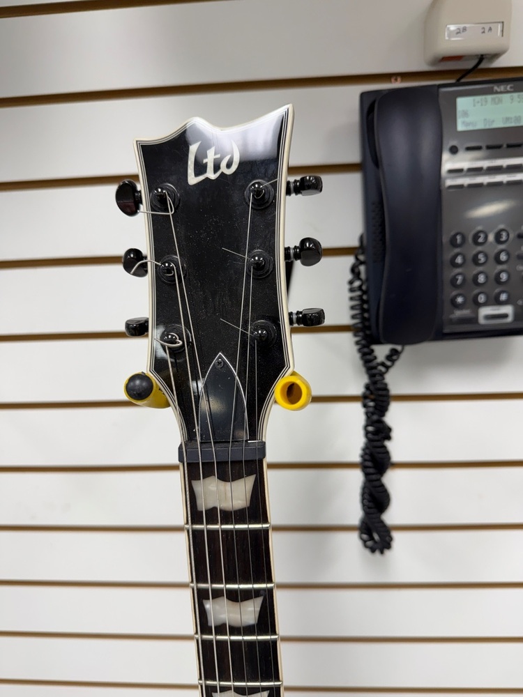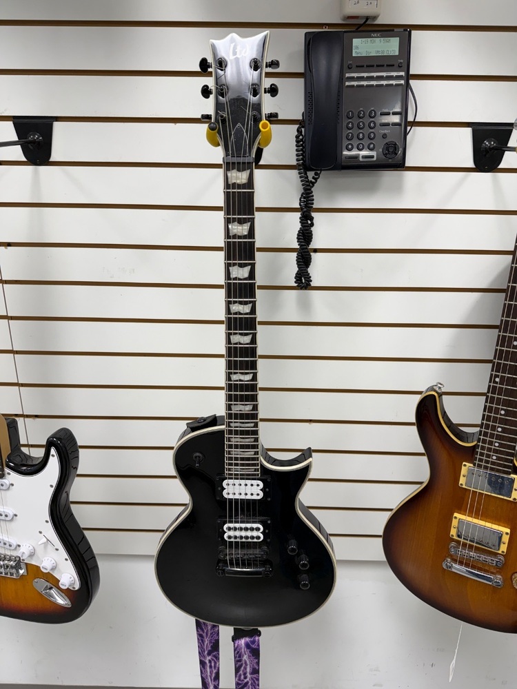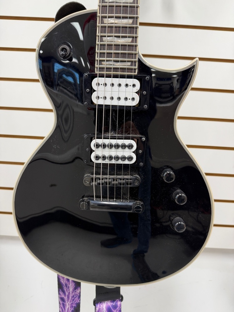 Feast your eyes on this beast! The Music Gear LTD EC Guitar - it's like Darth Vader had a lovechild with Jimi Hendrix. Black, sultry body wood that's more dramatic than a soap opera, a bridge that's sturdy enough for Bigfoot, and Seymour Duncan pickups that will make your eardrums scream with delight! Secret identity number: 321643. You'll find it lurking in WE013. Grab it quick – it's a wild one!