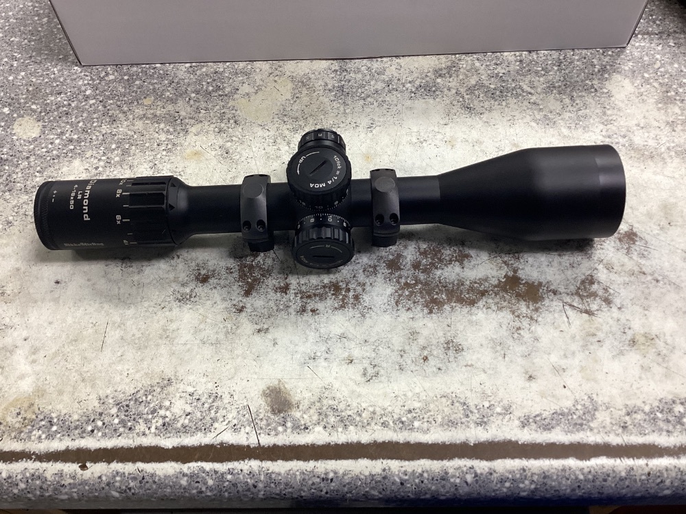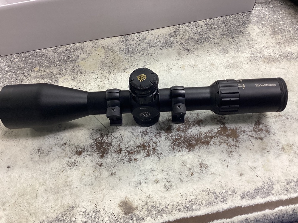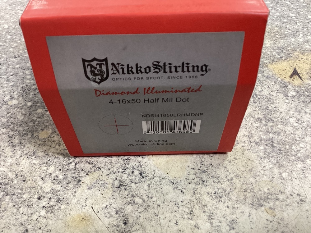 Behold the Nikko Stirling Diamond LR 4-16x50 Riflescope! Elegant in its original box, complete with scope mounts, a sunshade, and other cool accessories. A masterpiece in firearms enhancements, this scope accelerates precision while adding a dash of sophistication. This is more than a riflescope; it’s a sparkling gem for avid shooters.