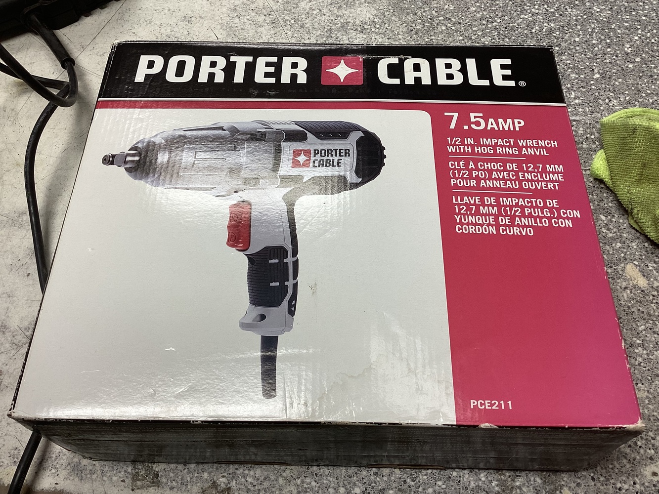 Power up your toolkit with Porter-Cable's PCE211! This corded, heavyweight champ of impact wrenches packs a cool 7.5 AMP punch. Featuring a 1/2-inch hog ring anvil for effortless bit changes and encased in a sturdy box, it's all set to torque at your command.
