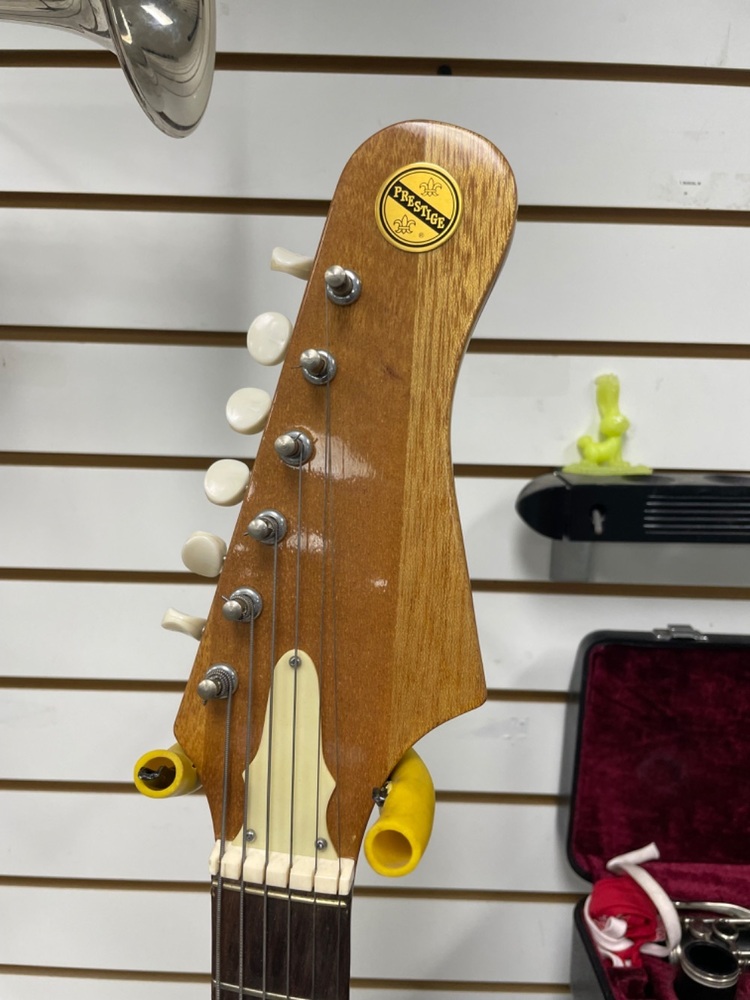 Vintage Prestige, a red-black electric guitar from Japan, a collector's treasure! With its unique serial number NVSN ID: 319368, it sports an exotic tortoiseshell pickguard, robust whammy bar, and strap. A music gear that blends elegance, history, and excellent sound—your key to eternal melodies.