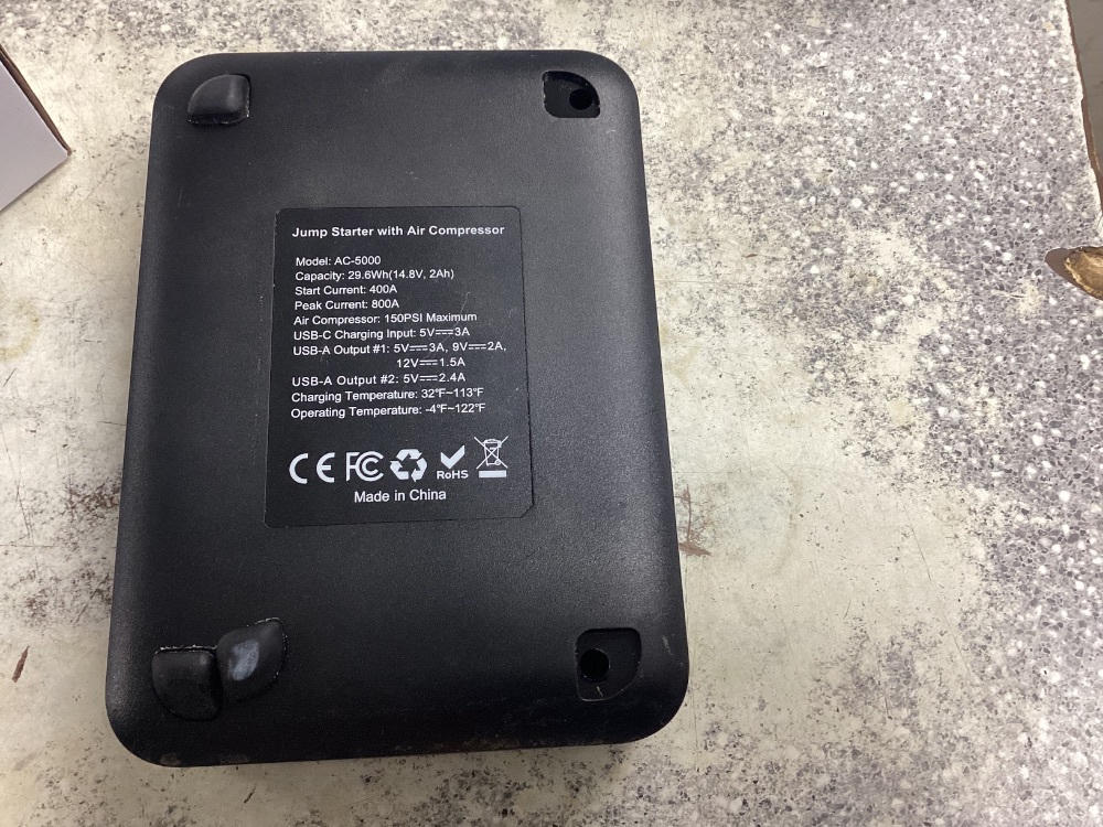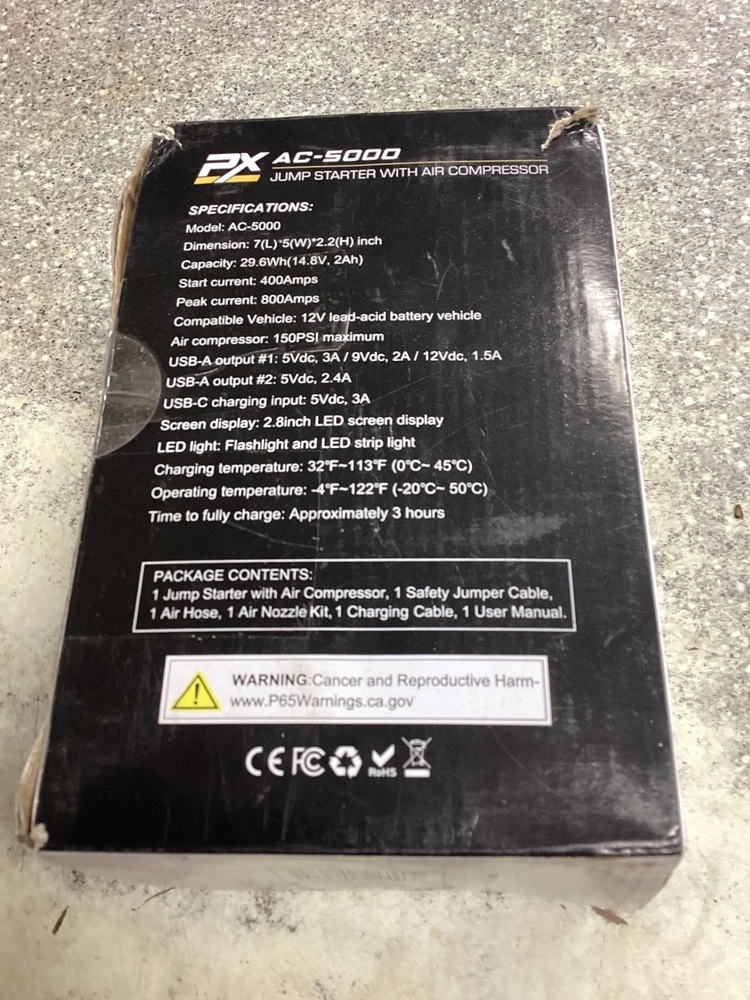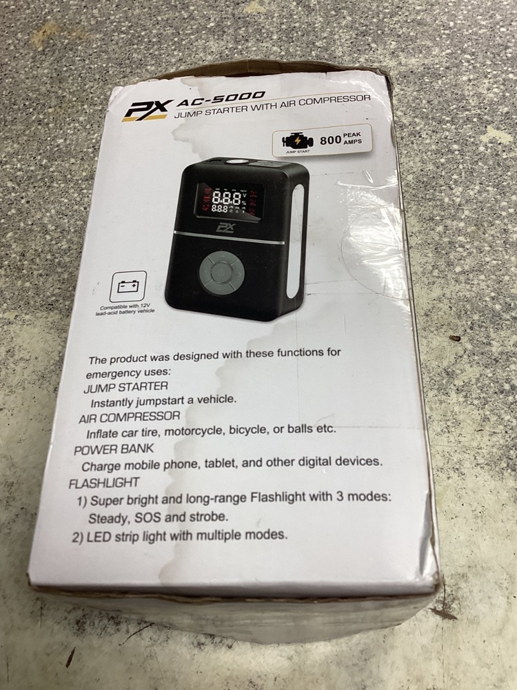 Experience the power at your fingertips with the PX AC-5000 Jump Box! A compact Hollywood of utility, this device isn't just an air compressor - it's your saviour in the dark with an inbuilt flashlight. Don't just work smart, work brighter!