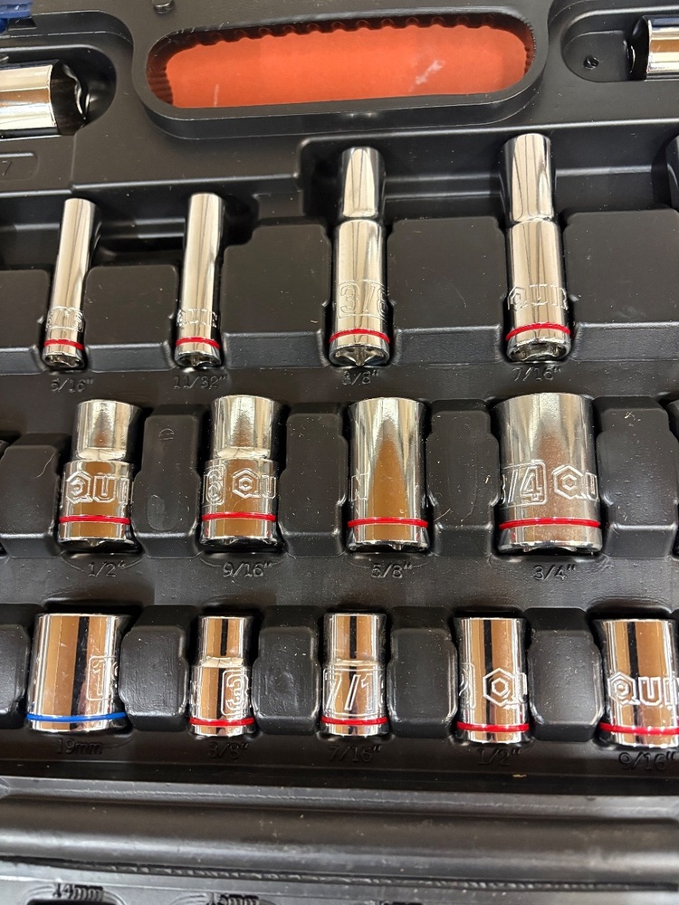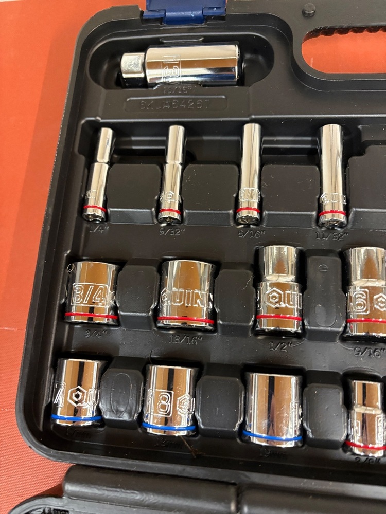 This 66-Piece Socket set by QUINN™ offers a range of the most widely used socket sizes. Constructed from rugged chrome-vanadium steel providing greater resistance and protection from scratches, rust, and corroding. Sturdy and durable enough for regular use, this SAE and Metric socket set also features high-visibility markings for quick and easy bit selection.