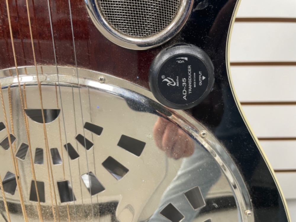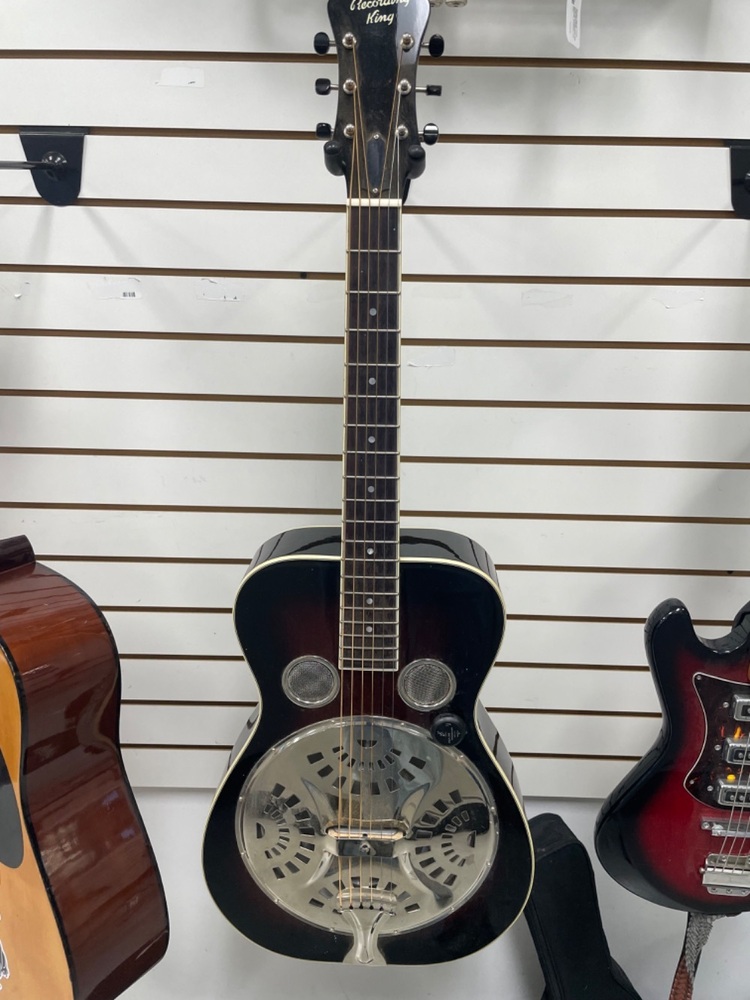 Unleash soulful melodies with the Recording King Resonator Guitar! Sporting a vintage, dark wood finish, it exudes timeless elegance. Its NSN ID: 319450, affirms its unique identity. Accompanied by a robust case for rock solid protection, this resonator guitar is a prime choice for the discerning musician.