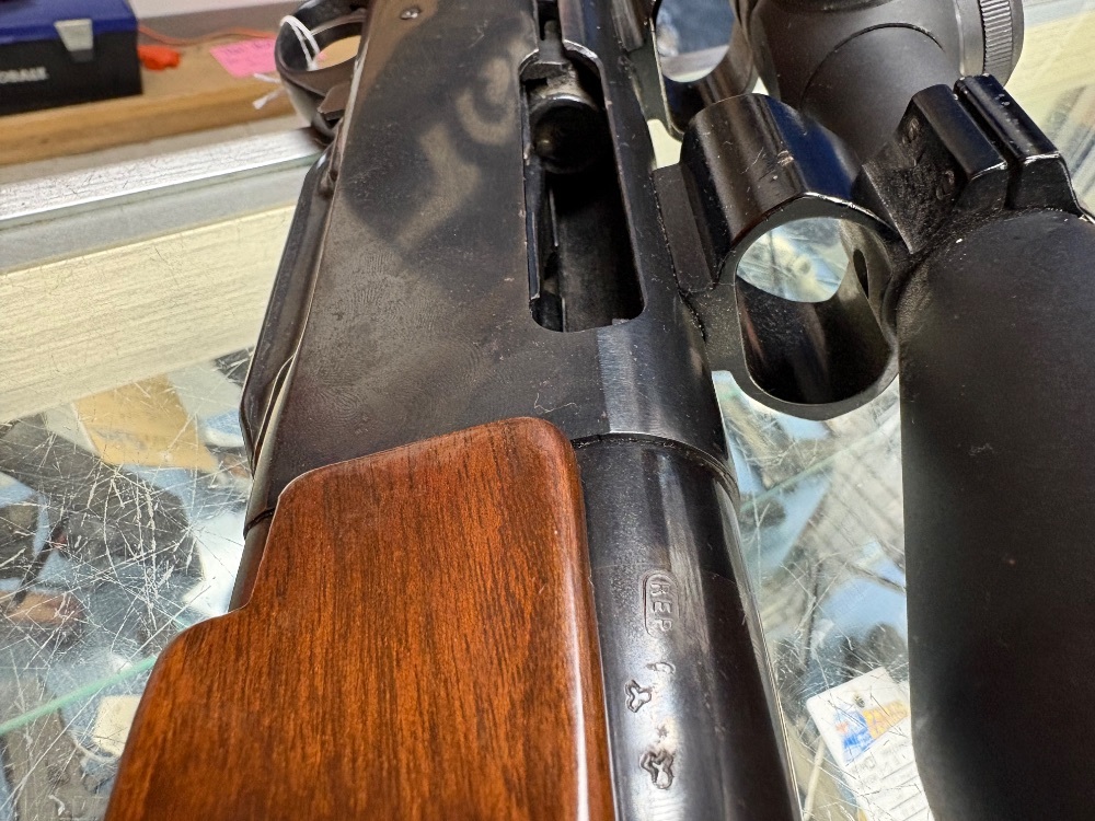 The Remington Arms Company's Semi-Auto .308 WIN Cal. 7400 rifle features a blued receiver and wood stock. The checkered stock ensures grip comfort and stability. Included is a Simmons 2.5-10x50 WA Scope to provide accurate targeting and shooting performance. An excellent choice for hunters and sport shooters.