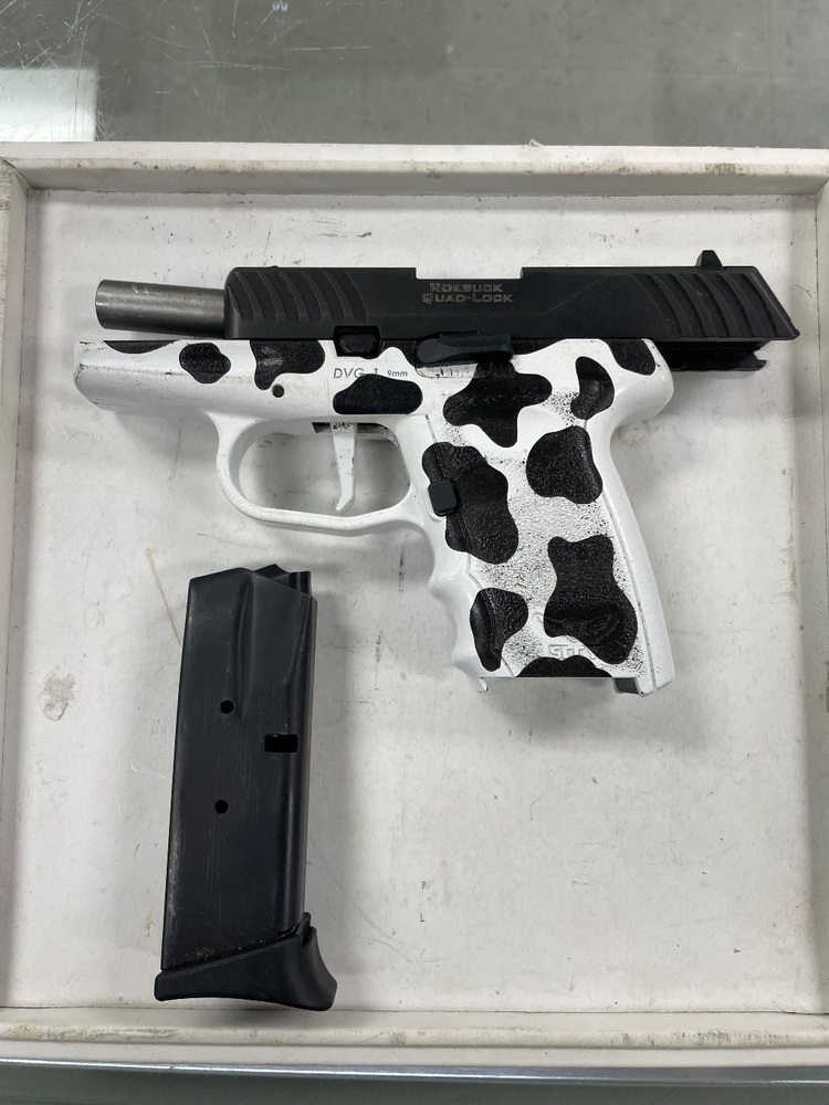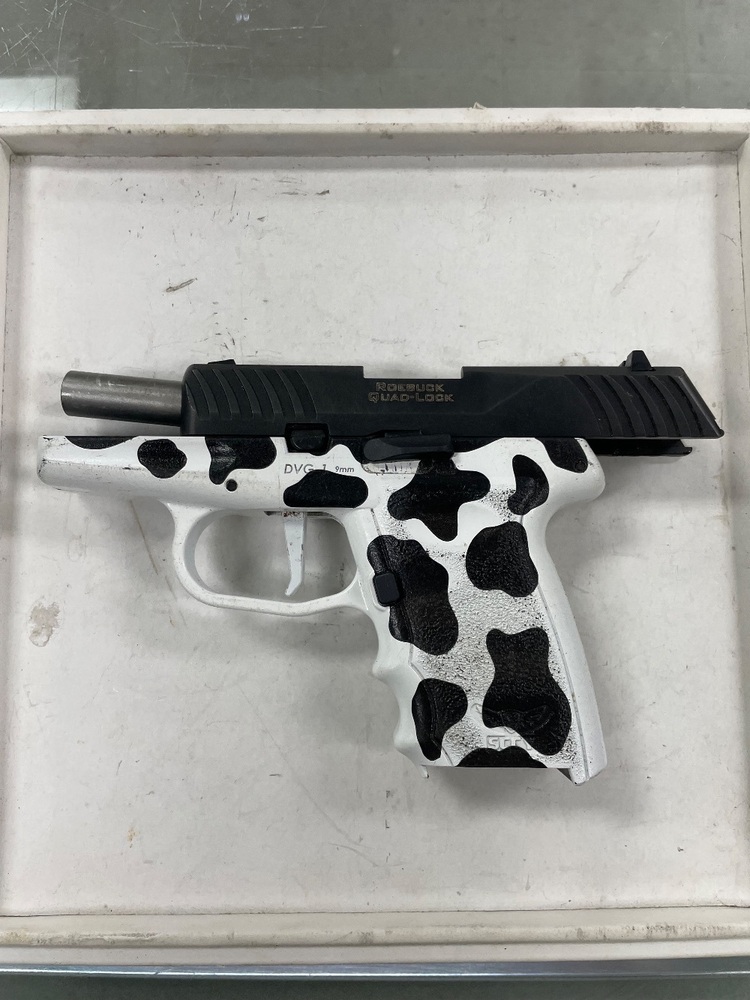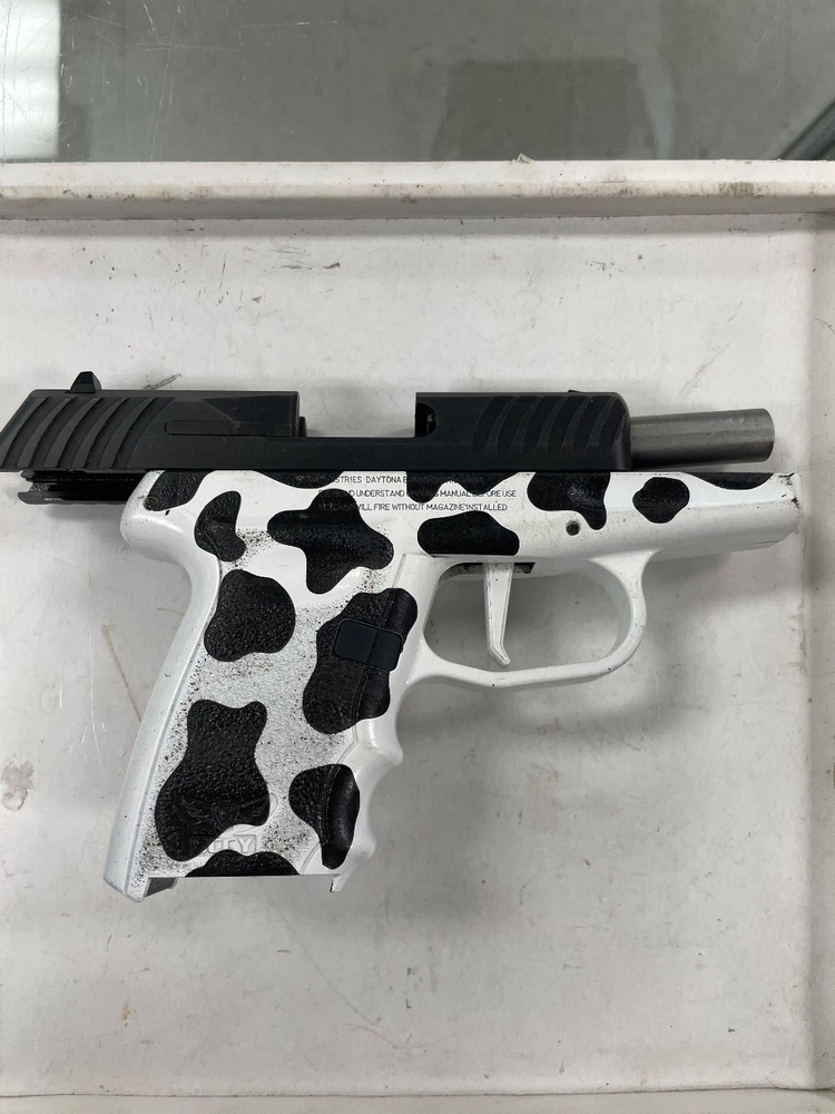 The SCCY INDUSTRIES DVG-1 is a semi-automatic, 9MM caliber pistol. Features a black slide, standout cow print frame, and accompanied by one magazine. Its sleek design integrates a compact structure, making it suitable for optimal concealed carry.
