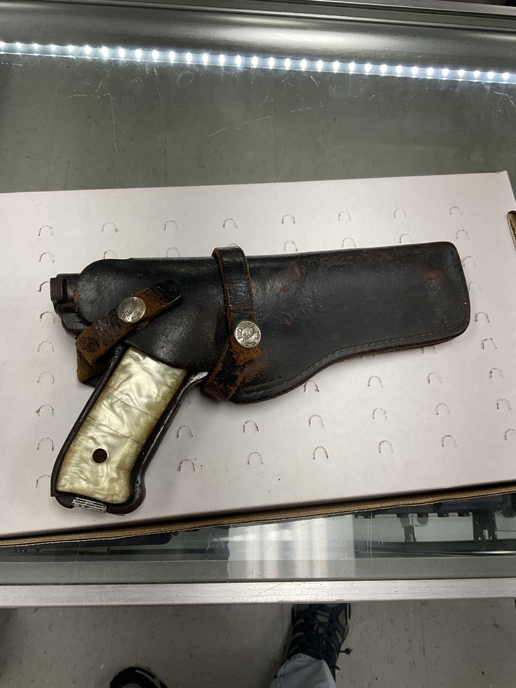 Meet The Valkyrie's Choice - a .22 LR Cal. Sturm, Ruger & Company Pistol. Its semi-automatic mechanism, a titan in the industry, strikes a fine balance of luxury and raw power. Travels comfortably in an aged leather holster, perfectly embossed, enhancing its classic appeal. Early Mark model, , embraces tradition. Your reliable steadfast companion in those unforeseen dire situations!